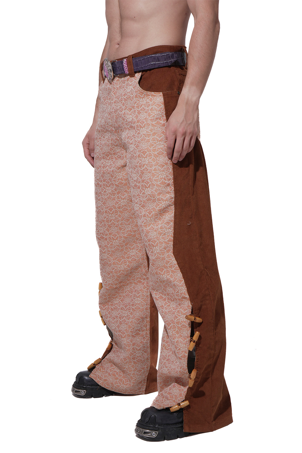 Pantalón baggy fit confeccionado en pana café y deadstock de tapicería con gráfico floreado. Modelo de cinco bolsillos con etiqueta PVC en bolsa de parche trasera derecha. Corte en costados simulando perneras con costuras giradas hacia delante. Cierre frontal de cremallera y botón. Presillas en pretina. Parte inferior con cierre de tarugos.