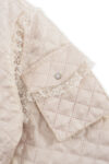 Cropped Bomber Jacket capitonada, color beige con gráfico floral; de hombro caído, cuello, puños y pretina acabados con elástico, bolsillos de cargo de broche en manga izquierda y delantero inferior derecho. Bajo delantero mas corto que la espalda, cierre frontal de cremallera; bolsillo interno en parte superior izquierda. Detalle de encaje en mangas y tapas de bolsa. Etiqueta PVC en parte superior central.
