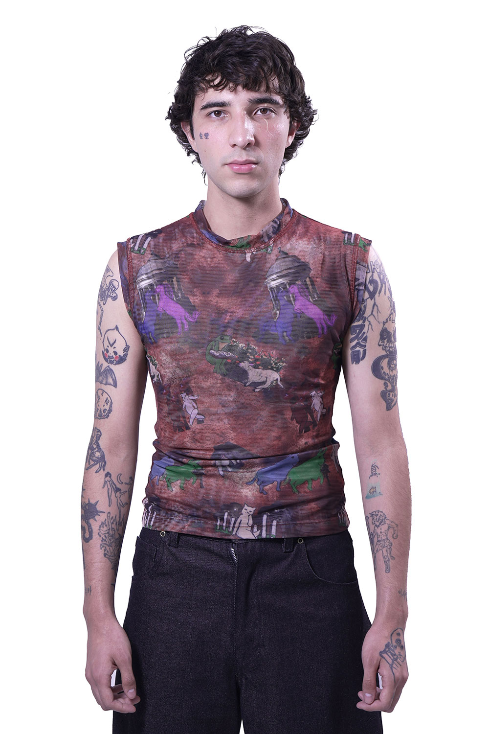 Top de mesh estampado, sin mangas; de corte ceñido; escote redondo. Vista en sisas y cuello; confeccionado con costura flat.