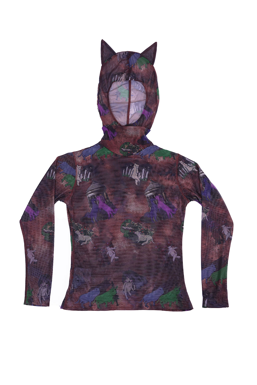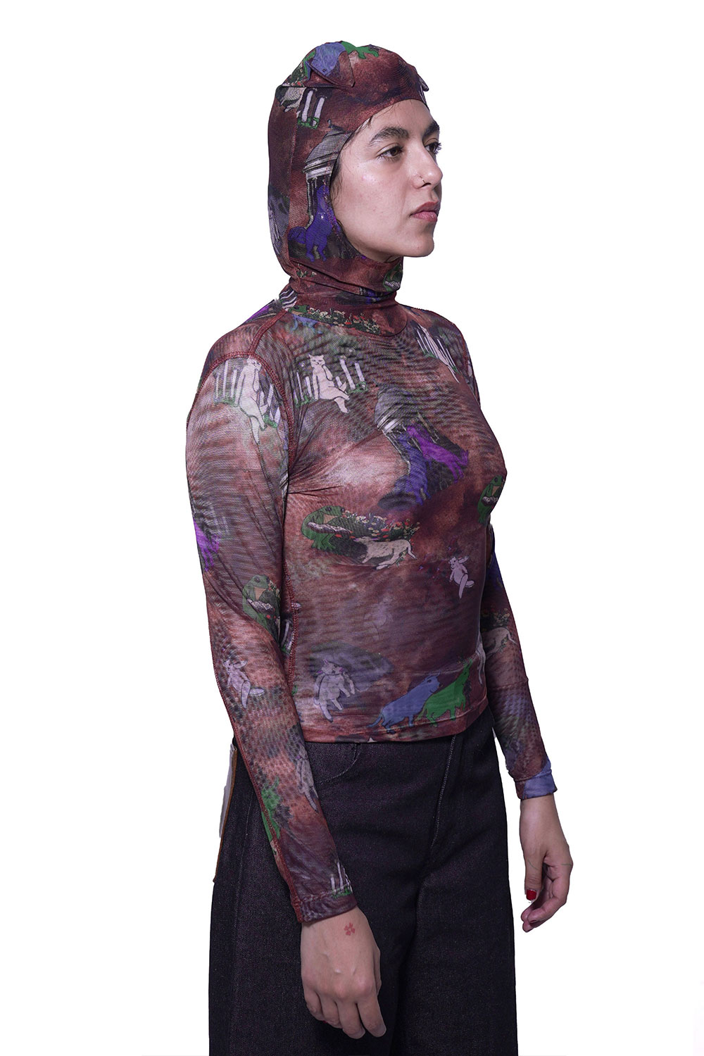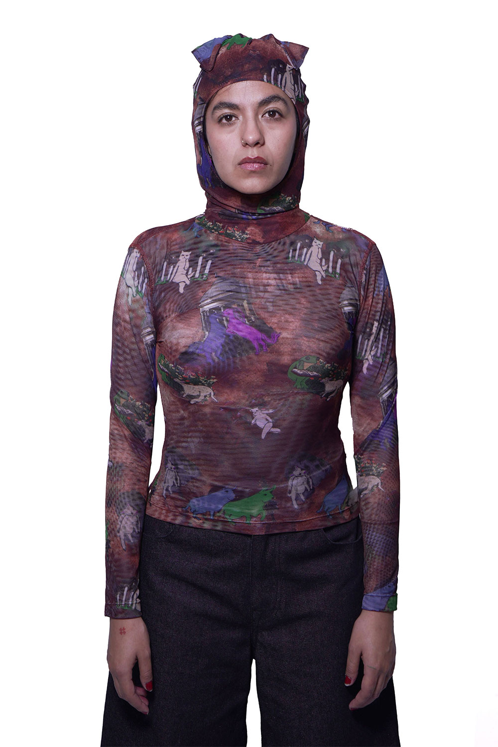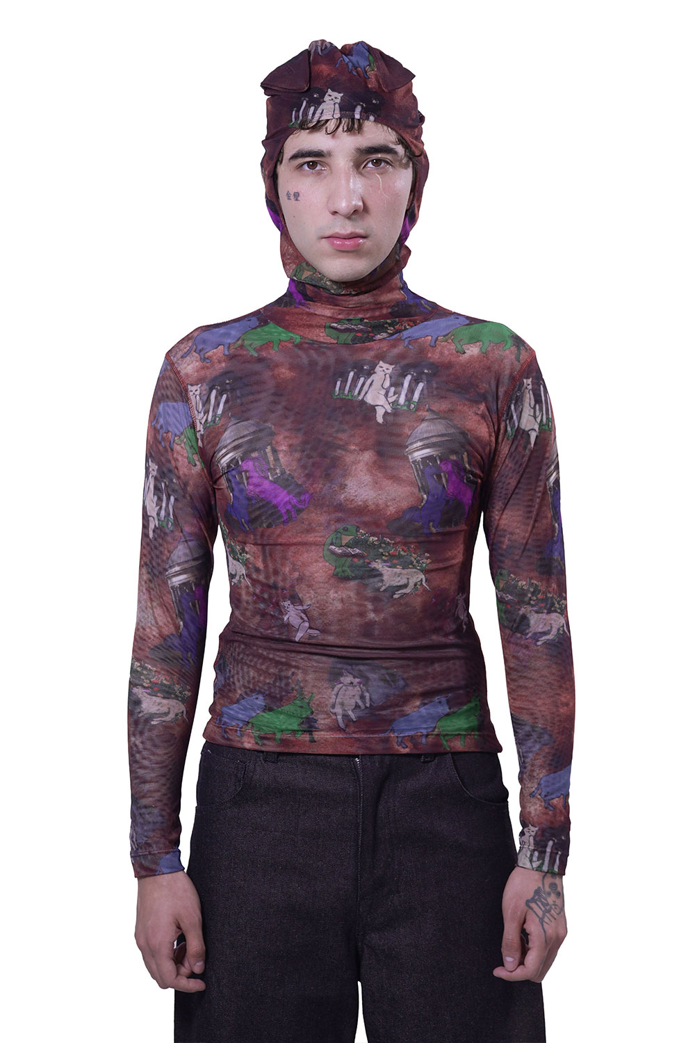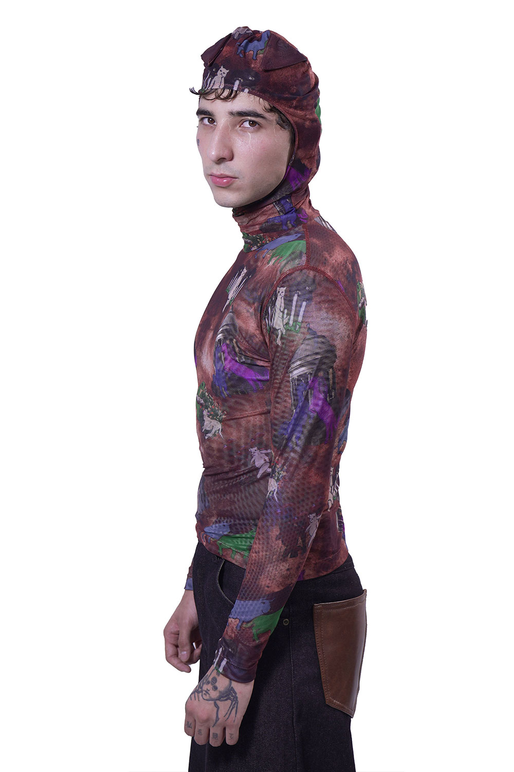 Top de mesh estampado de manga larga, de corte ceñido; escote redondo con cuello de la misma tela, máscara con orejas y confeccionado en costura flat.