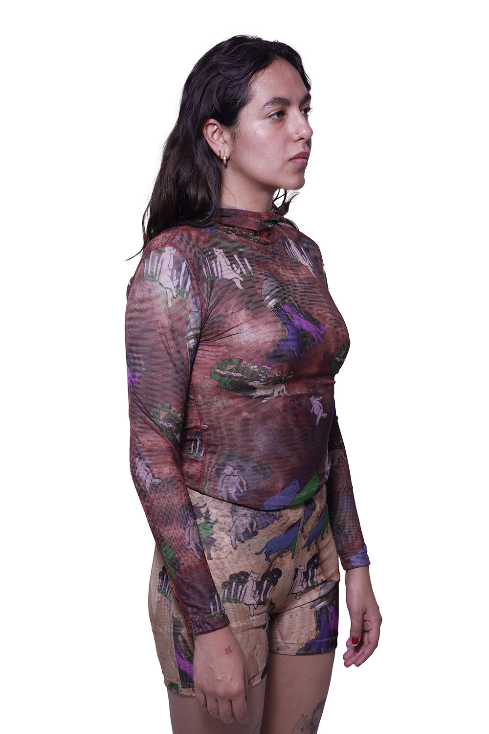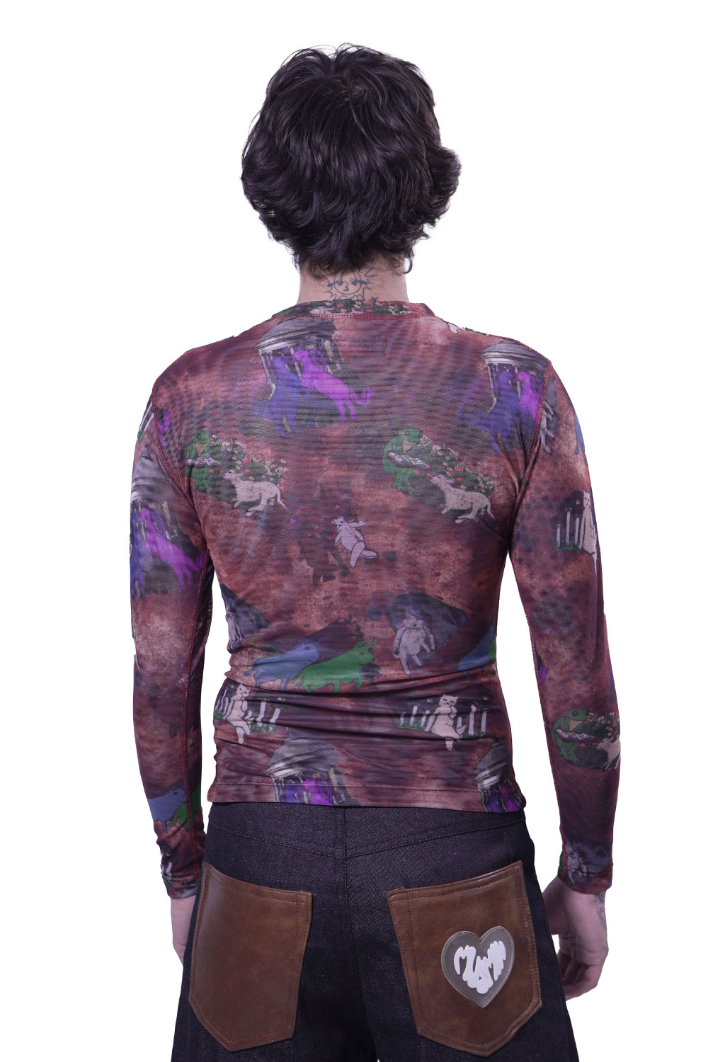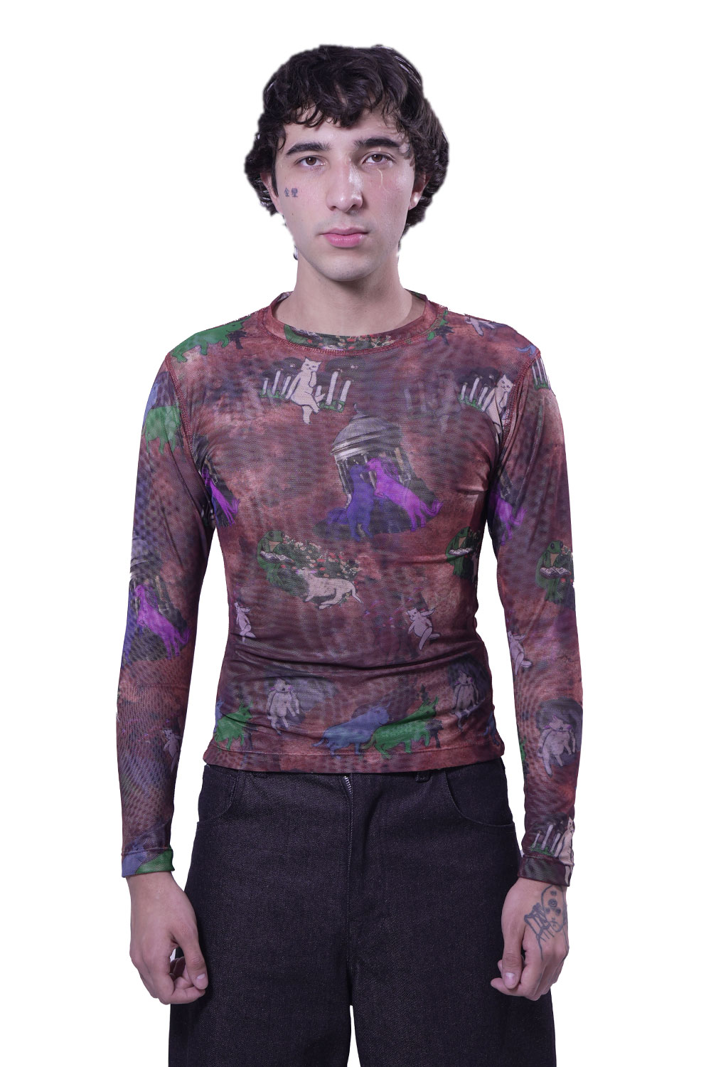 Top de mesh estampado de manga larga, de corte ceñido; escote redondo con vista, confeccionado en con costura flat.