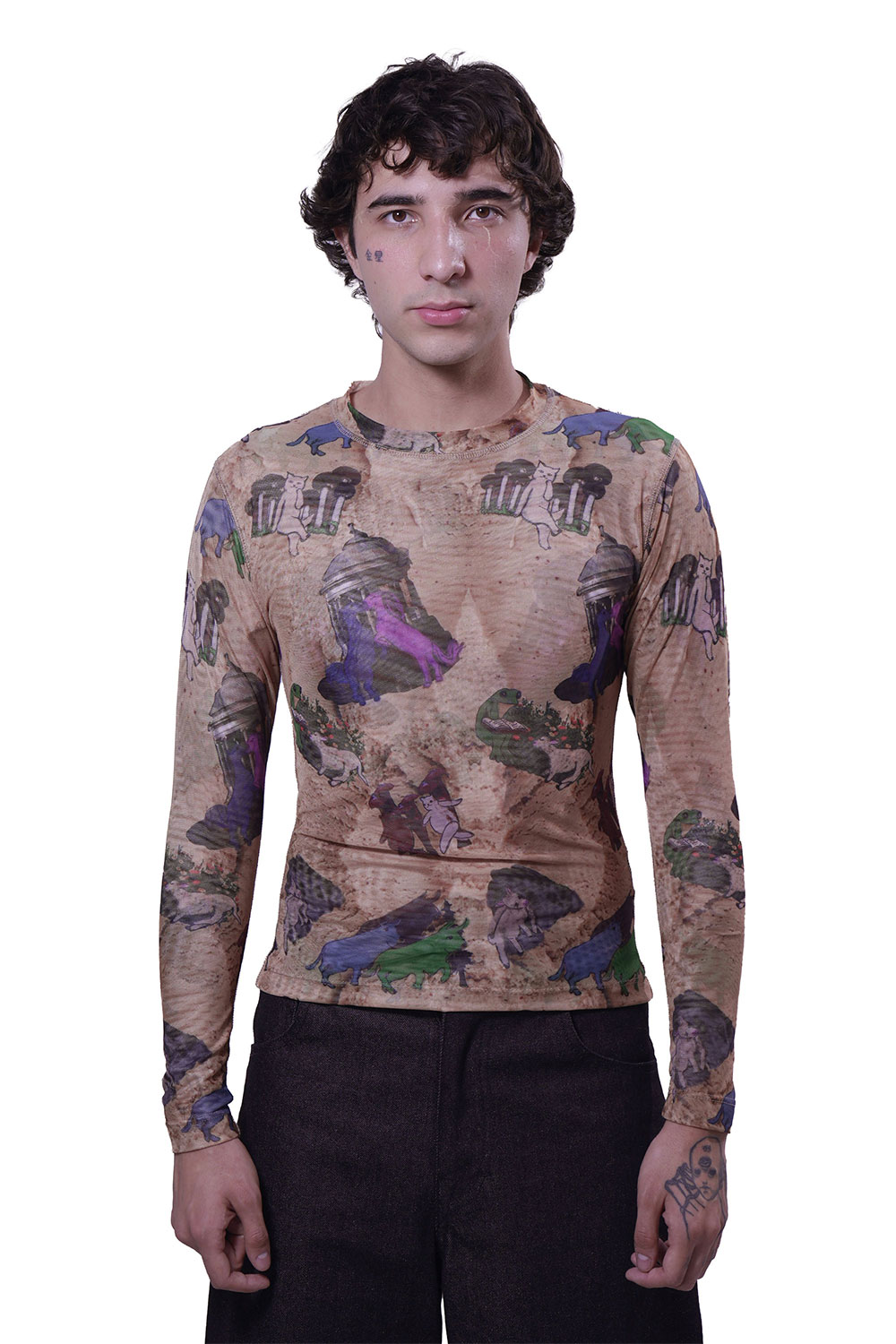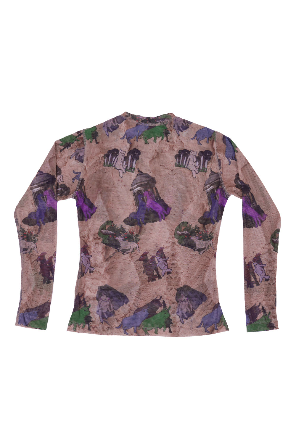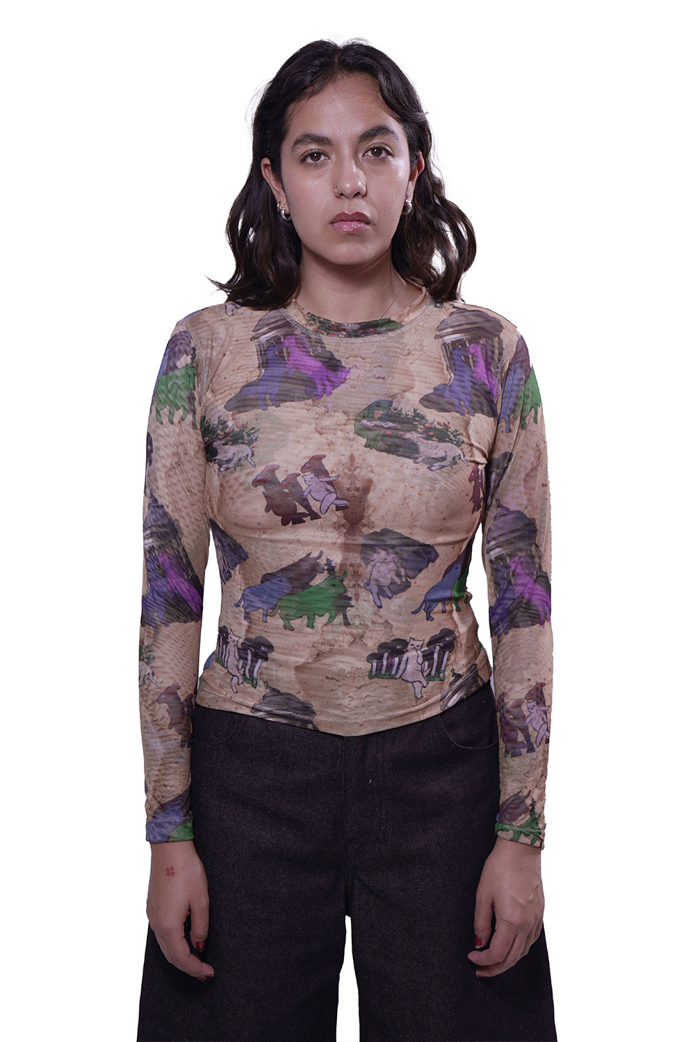 Top de mesh estampado de manga larga, de corte ceñido; escote redondo con vista, confeccionado en con costura flat.